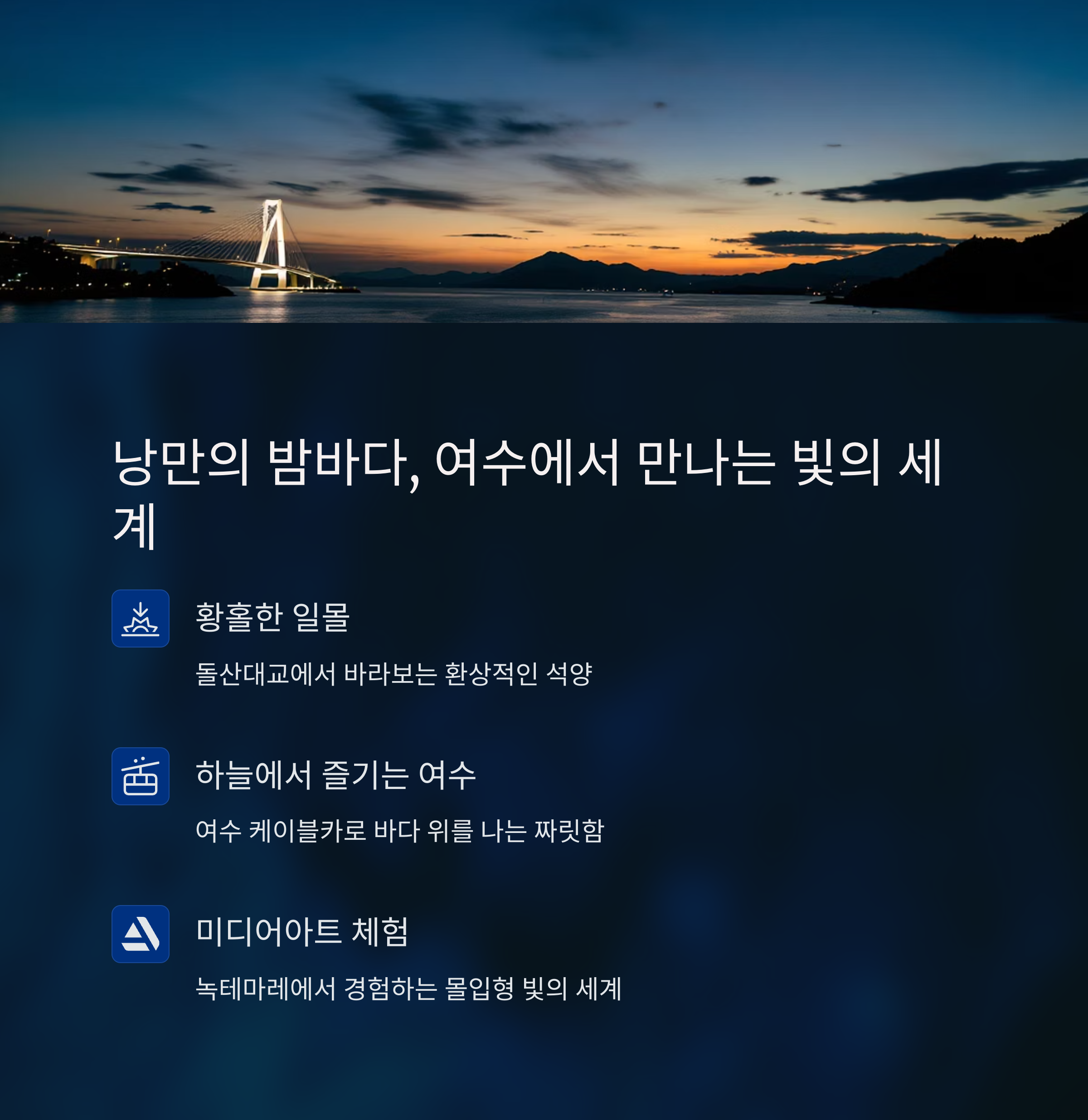 추천하는 국내 여행지 중 첫 번째는 경주입니다. 유적지와 고즈넉한 한옥 스테이, 넓은 공원이 혼자 걷기에도 좋고, 다양한 볼거리 덕분에 지루할 틈이 없습니다. 특히 동궁과 월지 야경은 홀로 마주했을 때 더욱 감성적으로 다가옵니다. 두 번째는 여수인데요. 바다와 일출, 맛있는 해산물까지 혼자서도 충분히 힐링할 수 있는 요소가 많습니다. 밤바다를 바라보며 여행의 의미를 되새겨보는 시간은 매우 소중합니다.