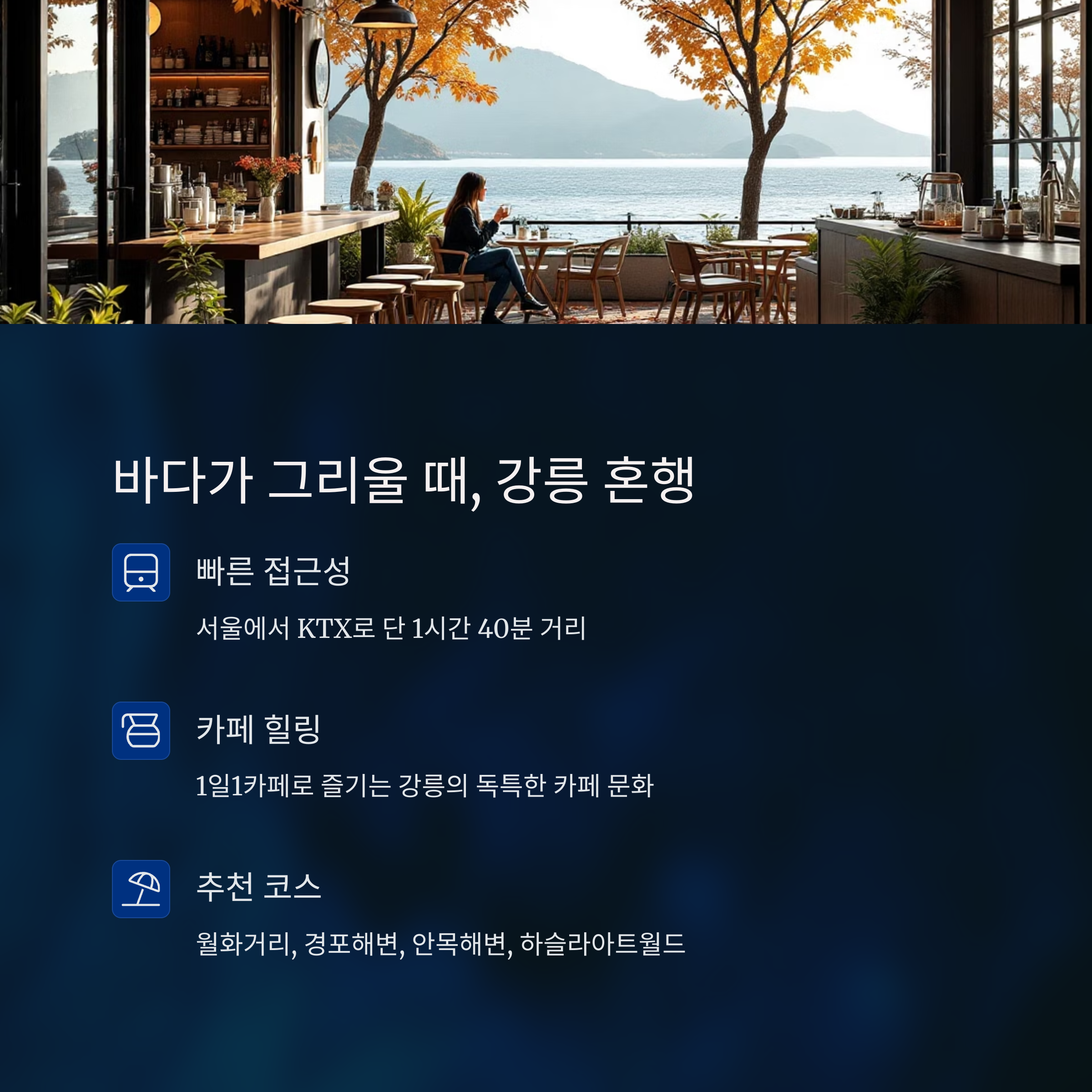 혼자 떠나는 여행은 타인의 시선이나 일정에 구애받지 않고 나 자신에게 집중할 수 있다는 점에서 큰 매력이 있습니다. 조용한 산책길을 걸으며 마음을 다스리고, 맛있는 한 끼로 소소한 행복을 느끼는 순간들이 깊은 감동으로 다가옵니다. 실제로 저는 강릉 안목해변을 혼자 걸으며 파도 소리를 들었던 경험이 아직도 생생하게 기억납니다. 이처럼 홀로 여행을 떠날 때는 무엇보다 ‘나와의 대화’가 중심이 됩니다. 일상에 지친 마음을 내려놓고, 자신만의 리듬으로 하루를 설계해보세요.